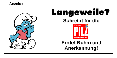Schließlich genügte alleine eine Warnung zur sofortigen Kapitulation der betroffenen Staaten und wir Schlümpfe erkannten, dass uns niemand mehr gefährlich werden konnte und sich auf dem Parkett politischer und militärischer Auseinandersetzungen keine Herausforderung mehr bot. Also vollzogen wir den letzten Schritt zur Omnipotenz und verließen, mit Hilfe eines Apparates namens FUX-TOOL, unsere kleinen blauen Körper, um unsere geistigen Potentiale zu einem mächtigen Kollektiv zu verschmelzen, der Superintelligenz SCHLUMPF. So zogen wir durch die Universen, auf der Suche nach neuen Herausforderungen und erreichten schließlich "IW" ... |
