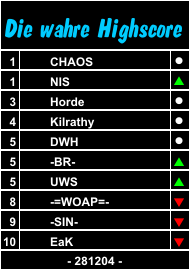 NIS ist nun gleichauf mit CHAOS auf Platz 1, was beweisen dürfte, dass wir die Plätze nicht auswürfeln, sondern fair berechnen. Einen großen Sprung machte -BR-, einen etwas kleineren UWS. Für drei Allianzen bedeutete das leider einen Abstieg. Was hat das nun alles zu bedeuten? Scheißegal, hauptsache bunt!