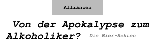 Der Leuchtende Berg - Trunkenheit und Bierkonsum war in unserem Universum immer schon ein Gegenstand der Politik, ja sogar von Kriegen. Der Alkohol scheint für viele mehr zu sein, als ein lustiger Zeitvertreib für die Leber, schon in der letzten Epoche schrieben sich diverse Allianzen den Rausch auf ihre Fahnen. Nach der Apokalpyse, in unserem neuerwachenden Universum, scheint dies noch einmal zugenommen zu haben. Woher rührt diese quasi-religiöse Anbetung des Alkohols und was für Auswirkungen hat das für die intergalaktische Politik? Besteht nicht die Gefahr, dass der eine oder andere Herrscher im Vollsuff den großen roten Knopf drückt? Wir haben uns mit einigen Repräsentanten der Bewegung unterhalten.