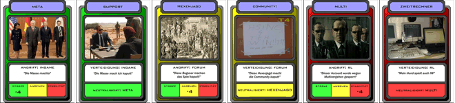 Nach der Boost-Phase beginnt die Kampfphase. Es gibt drei Kampfbereiche - "Ingame", "Forum" und "RL" - und darin jeweils Angriffs- und Verteidigungskarten. Angriffskarten verringern einen der Werte der gegnerischen Allianz und können nur durch die passenden Verteidigungs- karten neutralisiert werden. Die Ingame- Angriffskarte "Meta" verursacht einen Schaden von 4 auf die "Stärke", die Verteidigungskarte "Support" neutralisiert sie. Dabei ist zu beachten: Karten die einen Schaden von 4 verursachen sind nur einmal im Kartenstapel enthalten, die