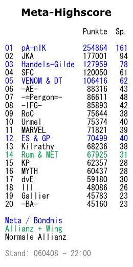 Bei Rum ist der Wing MET nicht nur aus Spaß dabei. Die Honigfans haben einen besseren Punkteschnitt als die Mutterallianz. Um Verbündete muss sich Rum wohl keine Sorgen machen, die Piraten packen das auch alleine.