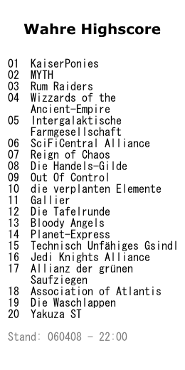 Das Gilde-Mitglied ES hat ein weiteres seperates Bündnis mit der Allianz GP und macht damit fast der Gilde Konkurrenz. ES hat sich jedenfalls gut abgesichert. Zumindest solange die Bündnisverpflichtungen nicht irgend- wann kollidieren. Dann gibts Stunk.