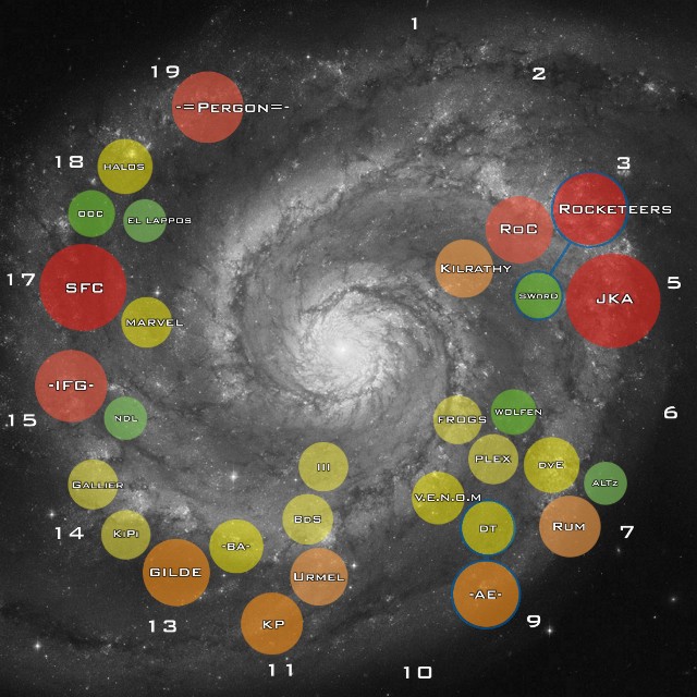 Die folgenden Allianzen und Bündnisse sind alle abgestiegen, ES & GP um wenige Plätze, Urmel und Kilrathy drastisch, um jeweils 6 Plätze. V.E.N.O.M, BdS und PLEX mit ihren Wings hat es gleich ganz aus den Top 20 gekegelt. Auch die -BA- konnte ihren Platz 20 vom letzten Mal nicht halten. Stattdessen finden wir in den unteren Rängen den Wiedereinsteiger MARVEL und zwei neugegründete Bündnisse: AGDIC & LOL und Wolfen & DNG.