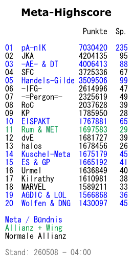 Wie zu erwarten liegt die pA-nIK-Meta weiter vorne und auch JKA hält ihren zweiten Platz. Doch darunter schiebt sich das Bündnis -AE- & DT an der SFC vorbei. -AE- hat nun einen Wing, die nicht gerade kleine Allianz UCA, was dem Allianzenverbund einen ordentlichen Punktezugewinn bringt. Dadurch fällt die Handels-Gilde um einen Platz, obwohl die Meta im Vergleich zur letzten Meta-Highscore wieder um 11 Spieler zugelegt hat.