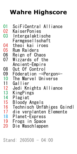 Den Anteil von Bündnis-Konstellationen an den Top 20 hat dies aber im Vergleich zur letzten Highscore nicht geändert. Es sind immer noch 11 von 20 Plätzen "normale" Allianzen.