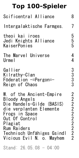 Immer noch stellt die SciFiCentral Alliance die meisten Spieler in den Top 100, aber diesmal mit Verlust. Es sind nur noch 8, statt wie beim letzten Mal 10. Danach ändert sich erst einmal gar nichts, die Allianzen haben es sich gemütlich eingerichtet. Erst bei den Allianzen mit 4 Top-Spielern hat sich einiges getan: The Marvel Universe, das letzte Mal noch mit einem einzigen Spieler in den Top 100, hat nun deren vier. Dafür verlieren die Rum Raiders zwei und auch die Gallier einen und sinken dementsprechend in der Rang- liste.