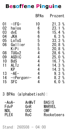 Von den drei Allianzen mit 5 Accounts sticht vor allem LoToS heraus, wo ein Drittel der Mitglieder besoffene Pin- guine sind. Es folgen noch acht Allianzen mit jeweils 4 BPAs, wovon die TUGv2 für ihre Größe den größten Prozentsatz an Unterstützern verbu- chen kann, während bei den übrigen Massenallianzen wie der SFC nur ein geringer Teil einen BPA besitzt, was wahrscheinlich vor allem an den vielen Neueinsteigern liegt. Die mit JKA zusammen größte Ansammlung von Spielern, die Allianz Rocketeers, hat nur 3 BPAs.