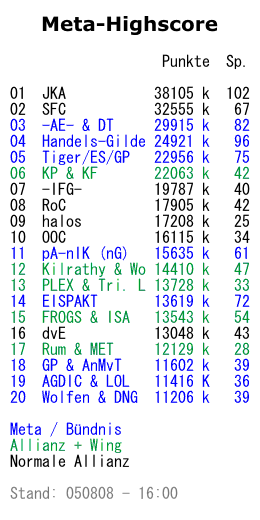 Das alte Bündnis [-AE-] & [DT] verliert 8 Spieler im Vergleich zum Vormonat und wird im Punktebereich von der [SFC] überholt. Damit stehen nun die beiden Top-Allianzen der regulären Highscore auch in der Meta-Highscore an erster Stelle. Auf den weiteren Plätzen folgen die schon bekannten Metas [Handels-Gilde] und [Tiger] & [ES] & [GP]. Knapp dahinter befindet sich nun [KP] mit dem Wing [KF], der noch einmal an Spielern gewachsen ist. Die [-IFG-] bleibt auf ihrem Platz, [RoC] und [halos] rücken jeweils einen nach vorne.