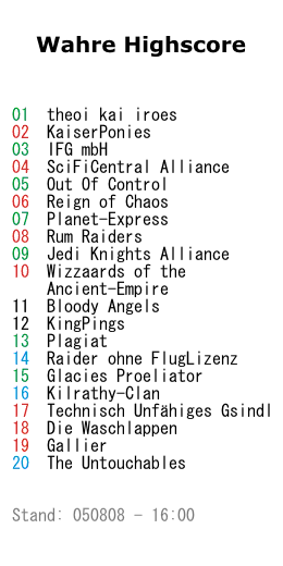Durch Krieg und Bomben beeinträch- tigt, verliert [KP] den ersten Platz an [halos]. Die oberen vier Plätze bleiben dennoch die üblichen Verdächtigen. [OOC] auf Platz 5 ist jedoch neu, eine weitere Folge der Fusion mit Teilen von [MARVEL]. Ein weiterer Teil gründete die Allianz [ROFL] neu und schaffte es auch gleich auf Platz 14 der Wahren Highscore. Die größten Aufsteiger sind [GP], [PLEX] und [Plagiat], deutlich abwärts geht es für [Gallier], [-AE-] und [TUGv2]. Neu in der Liste sind [Kilrathy] und [-Untouch-], während [-=Pergon=-] und [III] selbige wieder verlassen haben.
