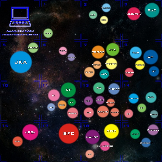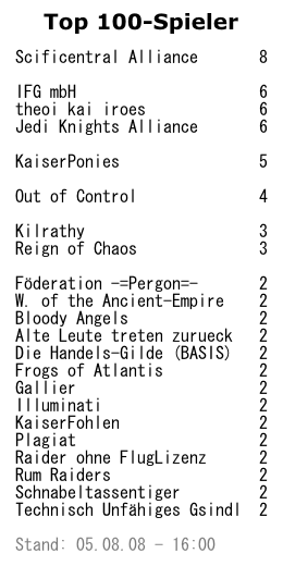 [halos] gewinnt zwei Top-Spieler hinzu und reiht sich nun bei [IFG] und [JKA] ein. [MARVEL] verschwindet bekannt- lich, stattdessen nimmt den Platz nun [OOC] ein. Die 3er-Gruppe dünnt sich deutlich aus: [-AE-], [III] und [Tiger] verlieren fürs erste ihren dritten Top-Spieler. Die 2er-Gruppe hingegen wächst um einige komplette Neuein- steiger: [ALTz], [KF] und die wieder- gegründete Allianz [ROFL].