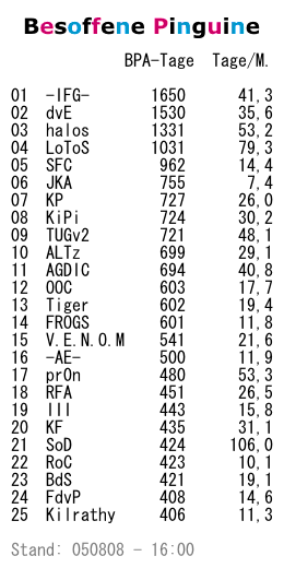 Um auch aus den BPAs eine richtige Highscore zu machen, berechnet sie sich nun nach insgesamt bezahlten Tagen und zeigt außerdem die Tage pro Allianzmitglied. Auf den ersten vier Plätzen ändert sich im Vergleich zur alten Rangliste nicht viel, aber beispielsweise [SFC], [OOC] und [FROGS] legen deutlich zu und [Gallier] und [BdS] verlieren ebenso deutlich. Im Bereich "Tage pro Mitglieder" sind vor allem [SoD] und [LoToS] auffällig.